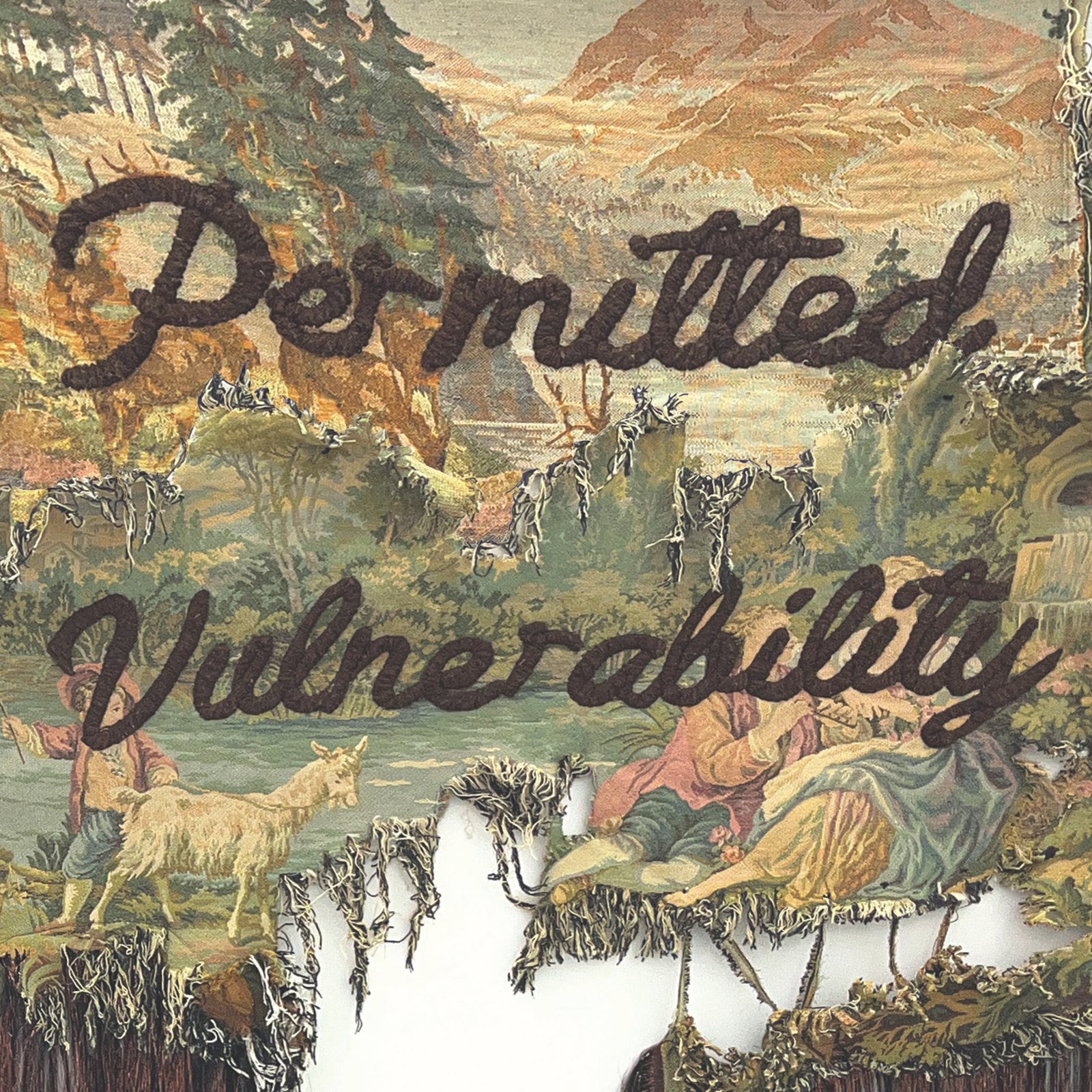 For several years, she has consistently developed a series of textile works based on decorative, bourgeois tapestries. She subjects them to processes of destruction and reconstruction: tearing, deconstructing, and then reassembling them, adding embroidered slogans. Language itself—phrases such as The Language of the Unheard, False Compassion, and History of Shame—forms the core of her practice. These slogans draw from different registers: the language of political protest, popular culture, and academic jargon. Their meanings remain fluid and contingent on the context in which they are presented.